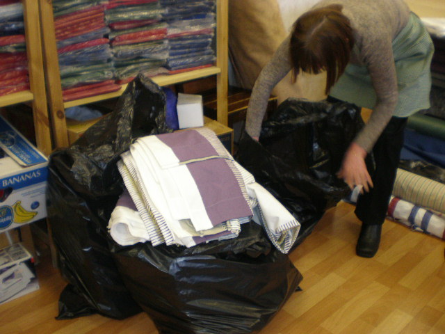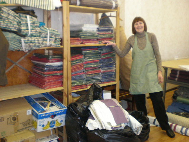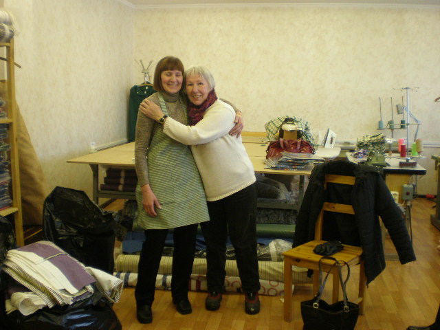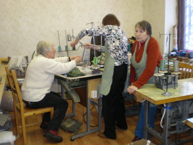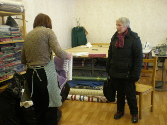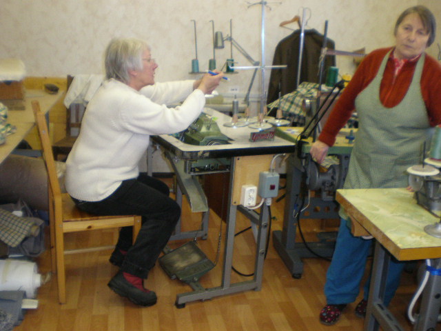 På syfabriken som BBC var med och startade förra året arbetar människor som på grund av handikapp av något slag har svårt att få ett vanligt jobb. Här lämnades tyger och symaterial och lite hjälp med krånglande maskiner!